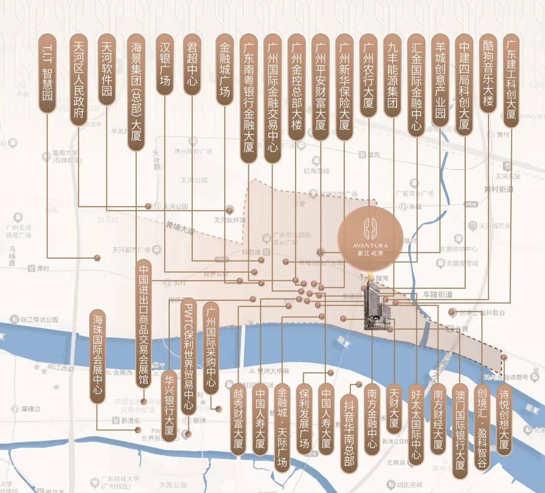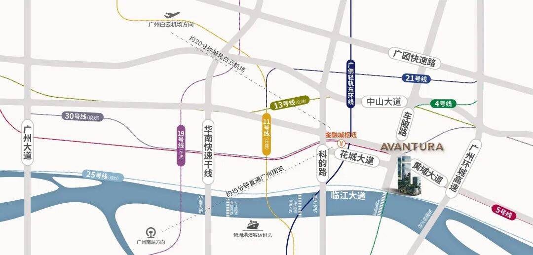 项目坐落于金融城东区 AT091434 地块,处于珠江新城与金融城双 CBD 联动核心,周边 80% 土地集聚金融总部、数字经济等国家级战略资源,已吸引 28 家世界 500 强企业进驻。距珠江最近处仅 120 米,坐拥南向一线 米,江、城双景尽收眼底。随着临江大道全线 分钟衔接白云机场,配合地下隧道环路系统,构建 “空铁联运” 的超级交通网络。