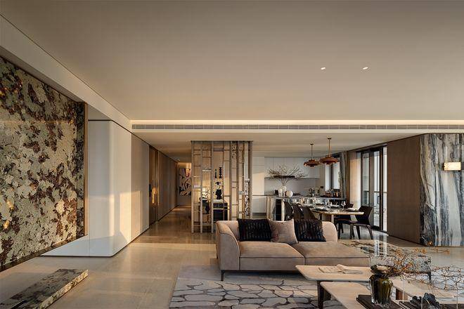 客餐厨顺势衔接、浑然一体,无一丝多余设计,美好生活的理想画卷徐徐展开。窗外高楼林立映江景,涛声阵阵入庭来,在这天然背景中,我们化身生活的主宰,肆意挥洒灵动笔触,为日常添彩。