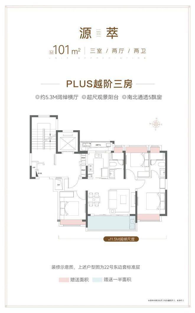 经典飞机户型+三开间朝南+餐客厨一体化+约5.3m的阔绰横厅,整体南向面宽达到约11.5m!整个户型的通透度和采光度很棒。