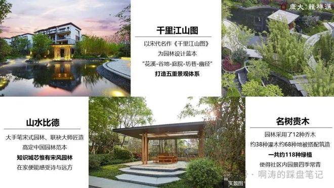 项目整体规划呈现出明显的低密度生态社区特征。总建筑规划中住宅容积率控制在相对舒适区间,社区内部以大尺度园林空间为核心组织逻辑。设计理念借鉴宋代山水文化意境,以《千里江山图》为景观规划灵感来源,通过花溪、谷地、庭院、坊巷、幽径五重景观体系构建归家动线。社区绿化体系中配置超过百种植被类型,其中包括乔木、灌木及地被植物多层结构,形成四季景观变化体系。
