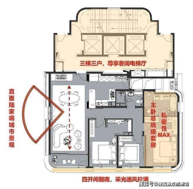陆家嘴太古源 源邸官方售楼处:户型四开间朝南,三间卧室均享南向采光,客餐厅中部的1㎡观景窗、约270°全景阳台共同将陆家嘴天际线引入室内,高区房源更可远眺江景。陆家嘴太古源 源邸官方售楼处: